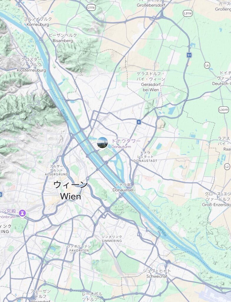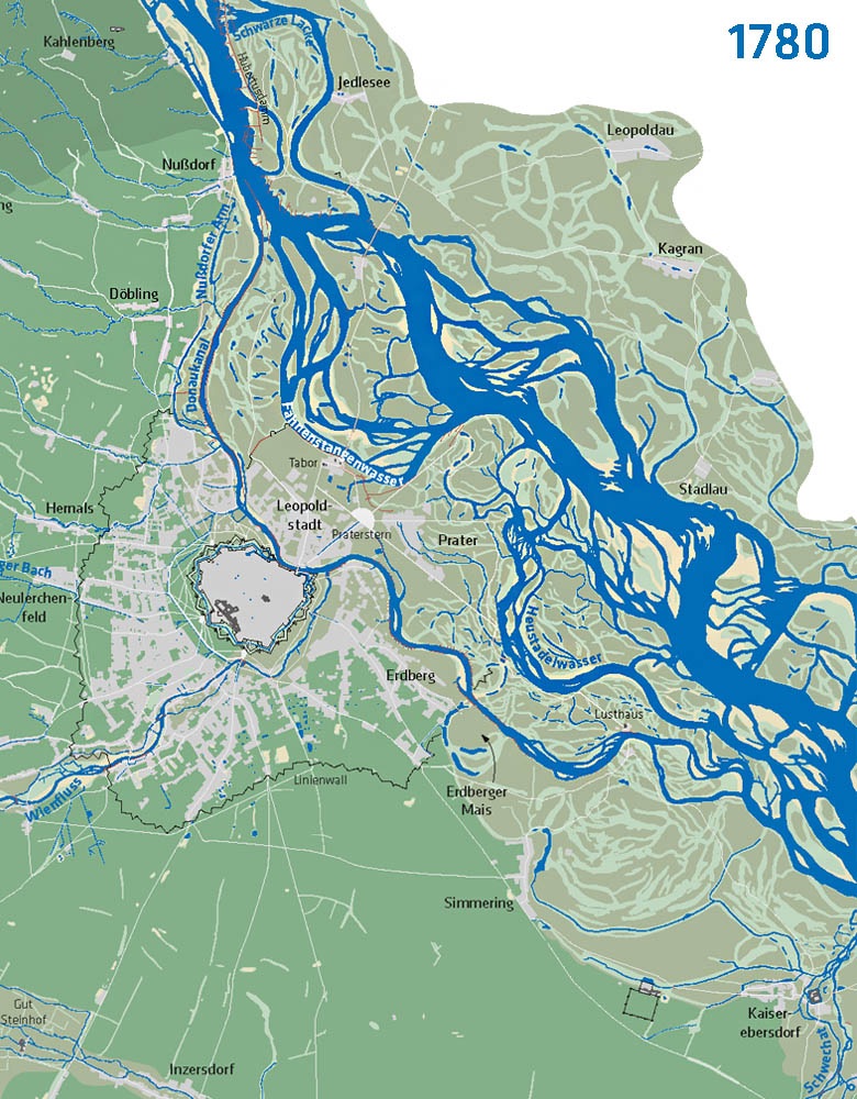 ウィーン近郊のドナウ川も、元はこんな感じに入り組んでいたものが整備された。荒川と東京の関係ともリンクしていて興味深い。